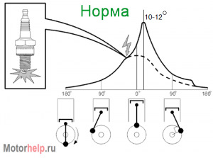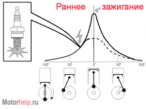 Пик максимального давления газов приходится на верхнюю мертвую точку движения поршня или даже раньше. То есть на начальном этапе сгорания ТВС газы давят на поршень в противоход, что естественно тоже снижает мощность двигателя и может стать причиной такого нежелательного явления как детонация.,